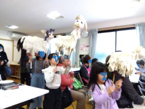 子どもたちが人形を操って高校生やそのお父さん、初めて友の家に来た大学生がセリフを言います。
