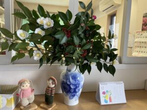 食堂のテーブルにも山茶花がお迎えしています。