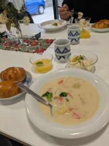 例会食はクリームシチューとサラダは林檎とかぶ(会員の畠ので美味しいし、蕪の葉の緑が嬉しい)アベック作業所のロールパン。黄桃寒。食後は檸檬ティー。