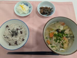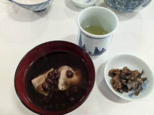 例会食:お赤飯(黒ゴマ)・実だくさんのお汁・柚子大根・餅入りぜんざい(昆布と鰹節の佃煮)