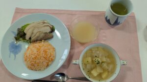キャロットライス・コーヒーチキン・スープ(じゃが芋・玉葱・セロリ)白桃寒 450円