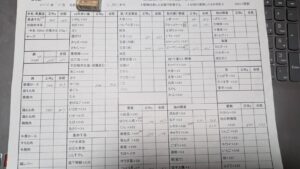・生協の配達があったら、野菜類は直ぐに計って届表に記入か、買い物調べの紙に記入。スーパーでの買い物はレシートに重さを記入。キャベツや白菜などは注文時の倍の重さがあることもある。肉類は表示がついているから楽。