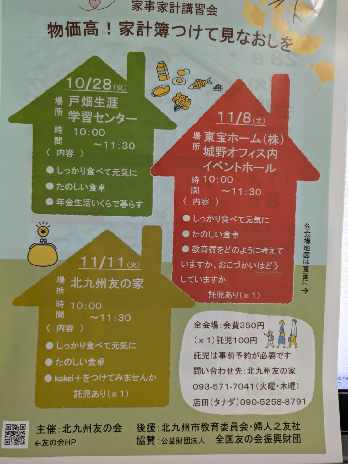 かけいぼカフェのおしらせ 家事家計講習会 2025.10.08 今年は3会場での家事家計講習会ですが、11月20日(木)10時から かけいぼカフェ を開きます。 場所は3番目の北九州友の家です。 美味しい珈琲,紅茶、ケーキやクッキーもお待ちしています。 家計簿に興味ある方もない方もいらっしゃいませ。