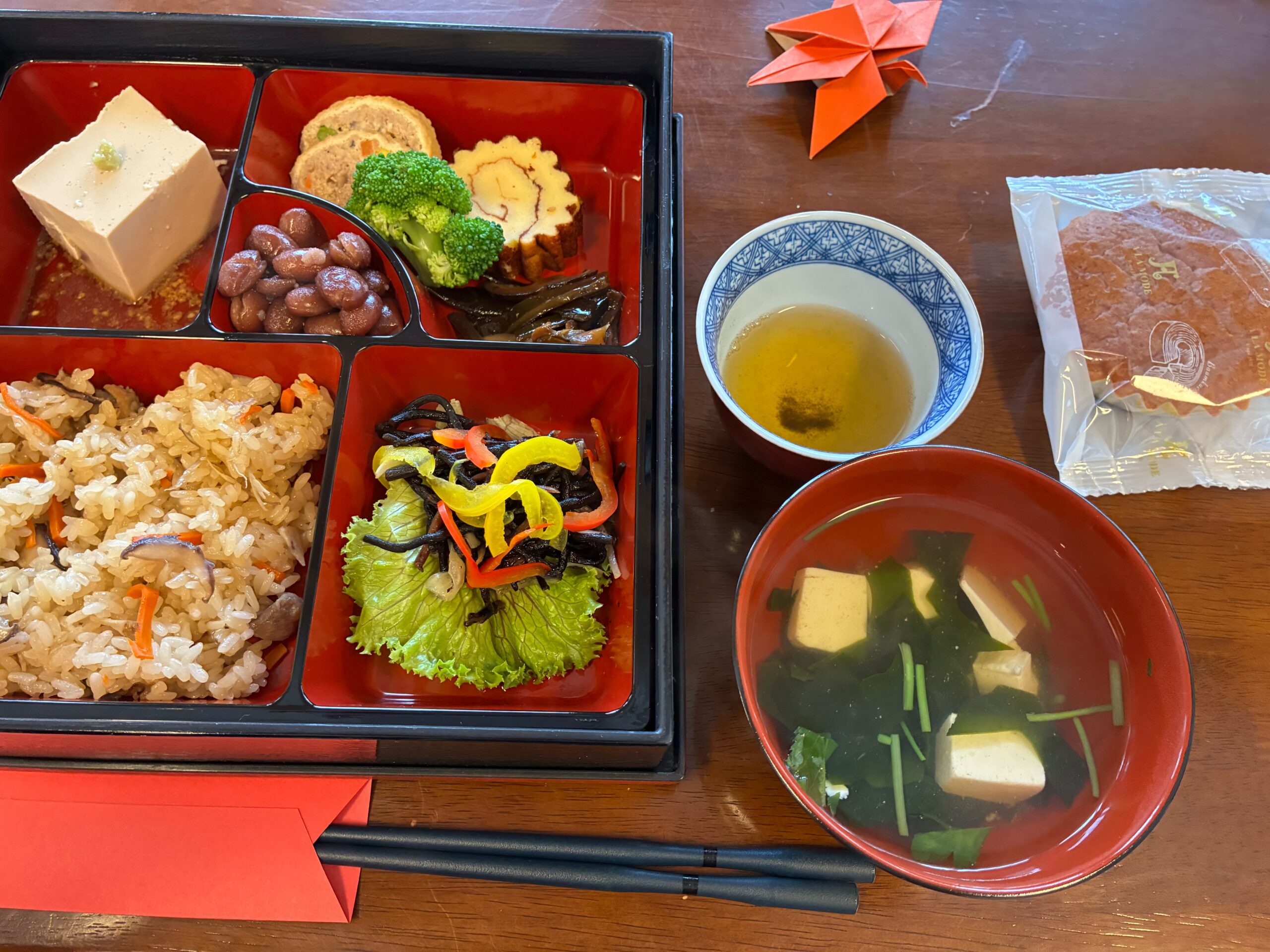 伊達巻き、金時豆甘煮 ヒジキマリネ(パプリカ)、ゴマ豆腐、茎ワカメ佃煮