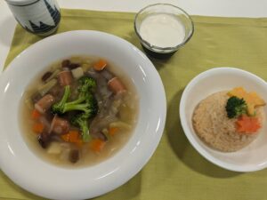 例会食はドイツ風スープ・キャッロットライス・コーヒーゼリー 450円。