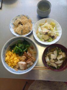 依頼講習会 講習会 2026.02.22 2月21日(土) 10時から小倉の南丘市民センターで、南丘校区女性部会からの依頼講習会を開きました。 「鍋帽子を使って」がテーマです。 鶏肉の蜂蜜煮を作り、ほうれん草のバター炒め、炒り卵の三色丼にしました。 白菜サラダに汁物、スイーツはわらび餅。美味しく美しく出来ました。 皆さん手際がよくて時間内にすべて作りあげ、ゆっくりお話ししながら食べました。