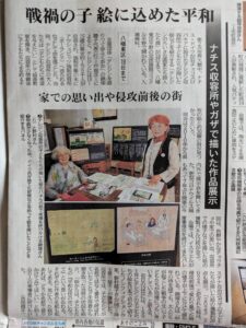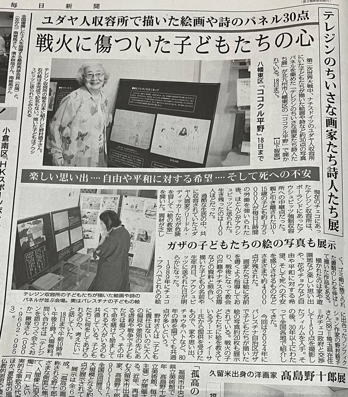 共催の「小さな画家たち詩人たち展」新聞掲載 お知らせ 2025.10.14 10月12日午前の取材の記事が14日毎日新聞朝刊に載りました。 北九州友の会共催は記事にはなりませんでした。残念。 でも記者さんには家事家計講習会のチラシは差し上げました。 午後は西日本新聞の取材でした。 今回のテレジン展の特徴はテレジンの子どもたちと80年後のガザの子どもたちの絵が一緒に飾られていることです。 子どもたちには罪はないのです。